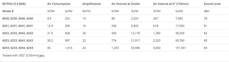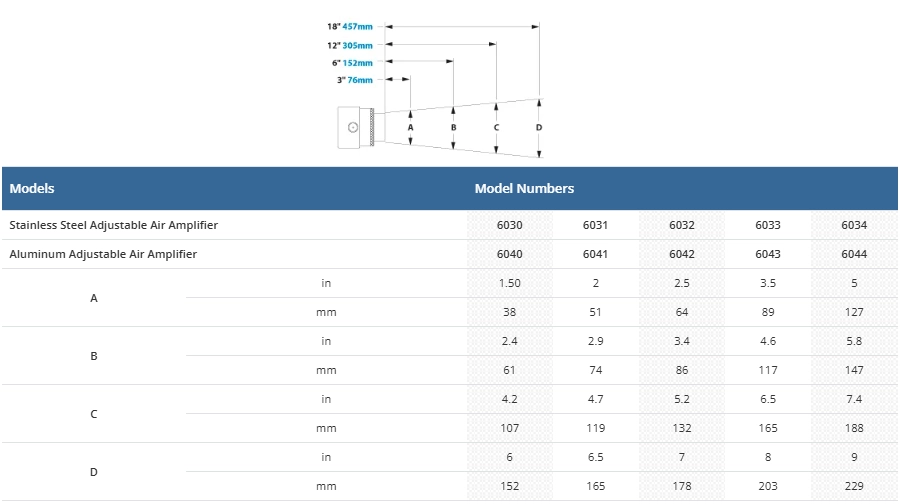 Force and flow for the Adjustable Air Amplifier is changed by turning the exhaust end (with the knurled ring loose) to open or close the continuous air gap. When desired performance is obtained, the knurled ring can be tightened to lock the flow at that setting. Utilizing a basic principle of fluidics, the Coanda effect, Air Amplifiers become a simple, low cost way to circulate air, move smoke, fumes, and light materials.
