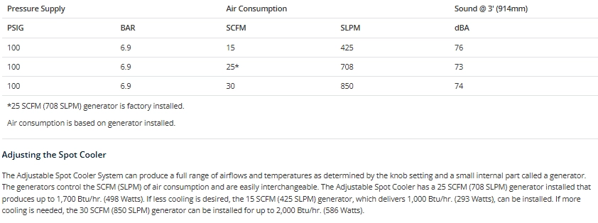 The adjustable spot cooler is installed with a 25 SCFM (708 SLPM) generator as standard however if less or more cooling is required these are easiy interchangable, please see performance figures below for more information.