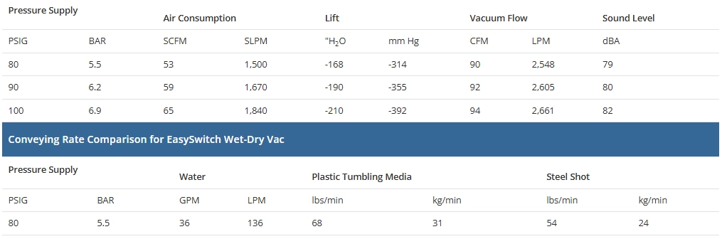The EasySwitch vacuum creates a powerful vacuum (at a quiet 79 decibels) without the need for electricity. Because the vacuum generator has no moving parts and uses no electricity, there is little concern for failed parts, motor failure or working with liquids associated with electric industrial vacuums.