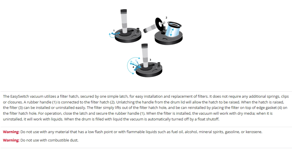The fast and tool-less conversion to vacuuming liquids is done by releasing one latch, removing the filter element and securing the latch. Simply reinstall the filter into the lid assembly for dry materials. The EasySwitch is designed to handle the toughest of industrial cleanup jobs with ease. It rests upon any 55 Gallon Drum. With EXAIR’s patent pending design, the EasySwitch vacuum uses a standard or HEPA certified filter when vacuuming dry material.