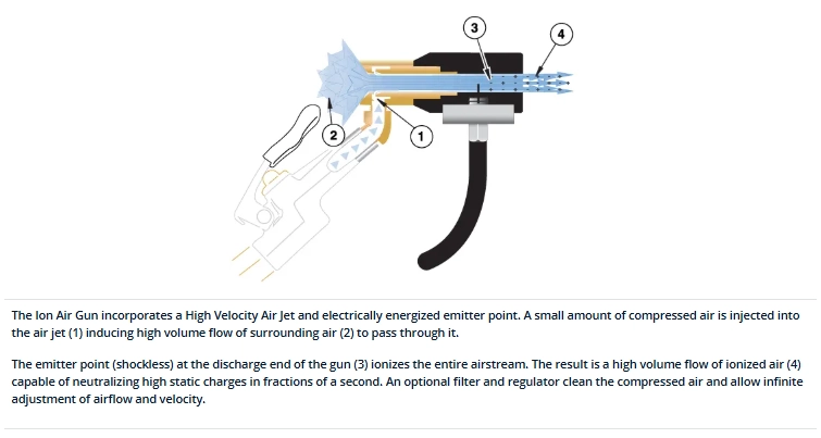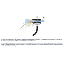 The patented Intellistat Ion Air Gun produces ionized compressed air to neutralize static and remove troublesome particulates during clean processes, test procedures and sensitive assembly work. With a +/-30 volt balance the Intellistat was designed to use minimal compressed air while delivering precise blowoff and exceptional static decay rates capable of reducing 1000 volts to less than 100 in under one second. A low voltage transformer converting 120V or 240V to 24V assures electrical safety, while EXAIR�s engineered air nozzle meet OSHA compressed air standards. Coming equipped with a short-throw, fast acting and effortless trigger, the Intellistat�s lightweight frame (less than 200 grams) allows extended use without fatigue. It is a dependable and low maintenance solution made of durable dissipative polycarbonate for applications requiring non-conductivity such as circuit board or electronic manufacturing. The ionized compressed air and design are ideal for sterile environments such as laboratories, clean rooms or for scientific testing facilities.