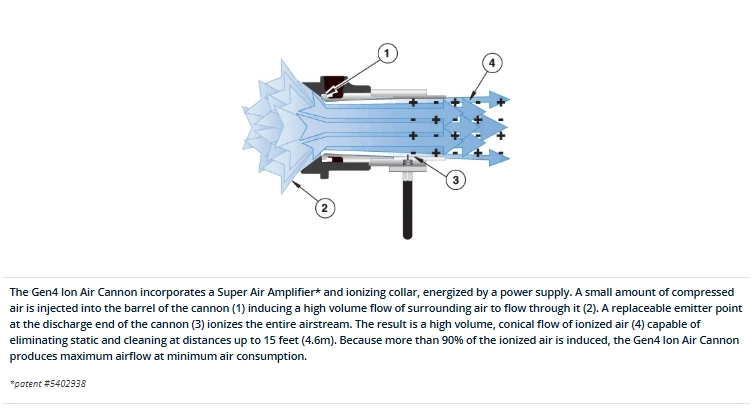 EXAIR's Gen4 Ion Air Cannon and Gen4 Power Supply includes the Model 7960 selectable voltage power supply (115VAC/230VAC, 50/60Hz). The Gen4 Ion Air Cannon neutralizes static electricity and cleans at distances up to 15 feet (4.6m) with no moving parts. It is ideal for those hard to reach spaces or confined areas that require a concentrated flow of static eliminating ions. With an optional pressure regulator, the air volume and velocity are infinitely adjustable over a wide range, for light to heavy duty applications.