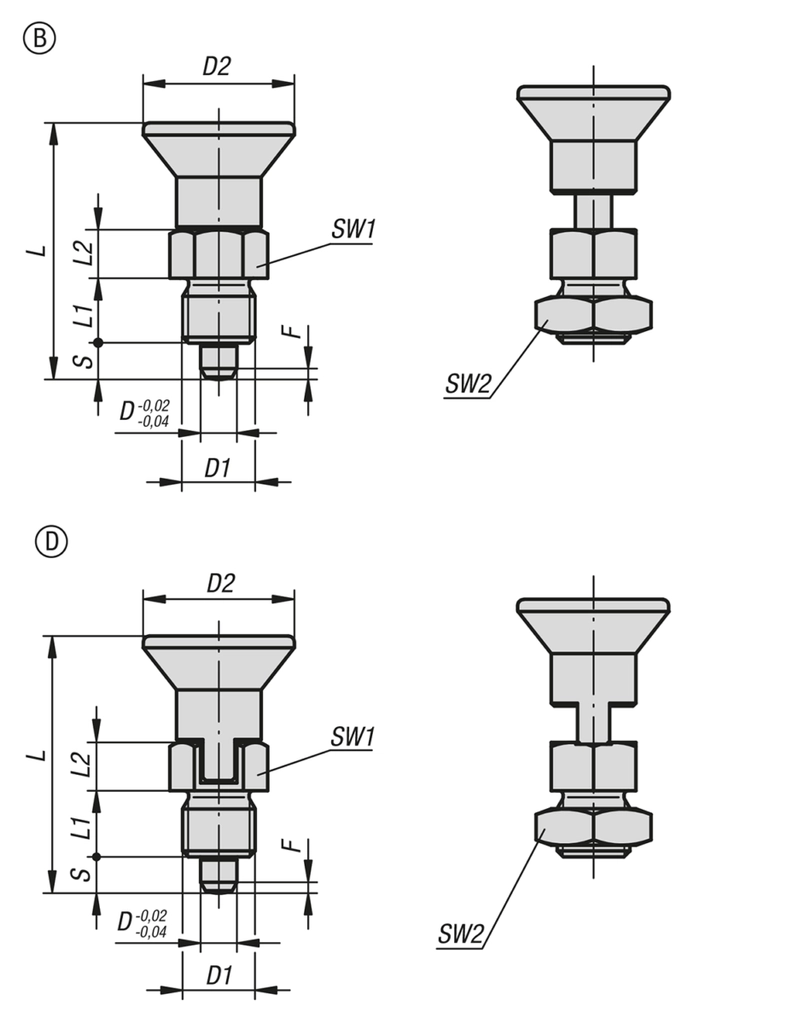 "short_description": "<div id=\"category-description-short-1\">\r\n<div style=\"text-align: left;\">\r\n<p><strong>Product Description:<\/strong><br \/>\r\nIndexing plungers are used to prevent any change in position due to lateral forces. A new locking position can only be set after the pin has been manually disengaged. style D is recommended for applications in which the pin is disengaged over extended periods and should be prevented from springing back.<\/p>\r\n\r\n<p><strong>Material<\/strong><br \/>\r\n<strong>Steel version:<\/strong><br \/>\r\nIhreaded sleeve and indexing pin, free-cutting steel.<br \/>\r\n<br \/>\r\n<strong>Stainless steel version:<\/strong><br \/>\r\nThreaded sleeve and indexing pin 1.4305 (AISI 303 equivalent).<\/p>\r\n\r\n<p>Mushroom grip. thermoplastic.<\/p>\r\n\r\n<p><strong>Version:<\/strong><br \/>\r\n<strong>Steel version:<\/strong><br \/>\r\nThreaded sleeve black oxidised.<br \/>\r\nIndexing pin hardened, ground and black oxidised.<\/p>\r\n\r\n<p><strong>Stainless steel version:<\/strong><br \/>\r\nThreaded sleeve bright.<br \/>\r\nIndexing pin hardened and ground, bright.<br \/>\r\nIndexing pin not hardened and ground, bright.<br \/>\r\n<br \/>\r\nMushroom grip thermoplastic black gray RAL7021.<\/p>\r\n\r\n<p><strong>Drawing Reference:<\/strong><br \/>\r\nstyle B: non-lockout type, with locknut<br \/>\r\nstyle D: lockout type, with locknut<\/p>\r\n\r\n<p><strong>Note:<\/strong><br \/>\r\nFor the inch range dimension D1 is in iches, all other dimensions are in mm.<br \/>\r\n <\/p>\r\n<\/div>\r\n\r\n<div class=\"category-desc-drawings\" style=\"display: flex; justify-content: center; flex-wrap: wrap; gap: 20px; margin-top: 20px;\"><img src=\"https:\/\/images.shopcdn.co.uk\/8a\/67\/8a67cb4b50e0ad7a5fc991a81fee4f3b\/1024x1024\/webp\/fit?quality=100&compression=100&t=1763113664\" \/><\/div>\r\n<\/div>",