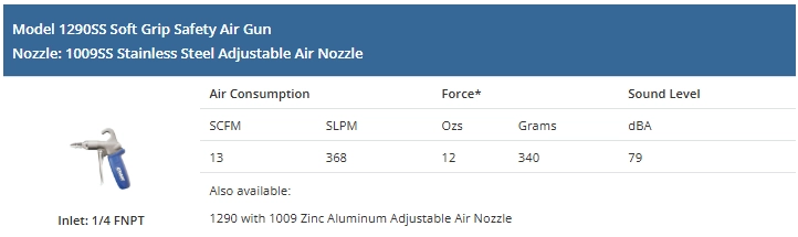 EXAIR's Soft Grip Safety Air Gun is ideal for hours of continuous use without fatigue. The ergonomic design keeps the hand in a comfortable position and incorporates a large trigger that permits operation with one or more fingers. The durable cast aluminum body is suited for rugged industrial use and includes a convenient hanger hook for easy storage. These guns with EXAIR engineered nozzles minimize compressed air use, maintain OSHA pressure standard 1910.242(b) and reduce noise exposure by remaining under OSHA standard 29 CFR 1910.95(a) decibel limits.